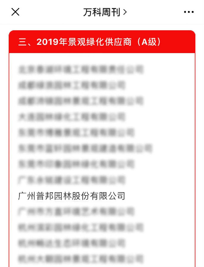 2月12日,萬科集團發(fā)布了《萬科2019年度合格供應(yīng)商名錄》,我司憑借優(yōu)質(zhì)專業(yè)的服務(wù),從眾多供應(yīng)商中脫穎而出,入選景觀綠化類供應(yīng)商A級(最高等級)。此次參評供應(yīng)商共計1500余家,獲得“A級供應(yīng)商”稱號的入選率僅為16%。此次入選,不僅代表萬科集團對我司專業(yè)水平的充分認(rèn)可,更是對我司承接萬科業(yè)務(wù)團隊和項目組辛勤耕耘的最好激勵。